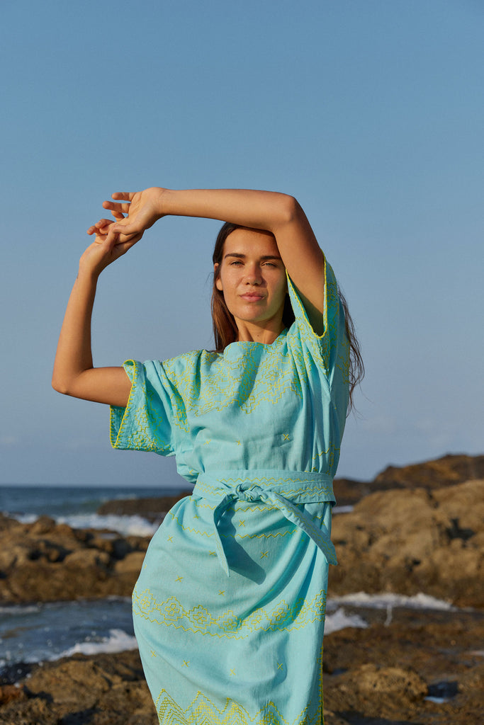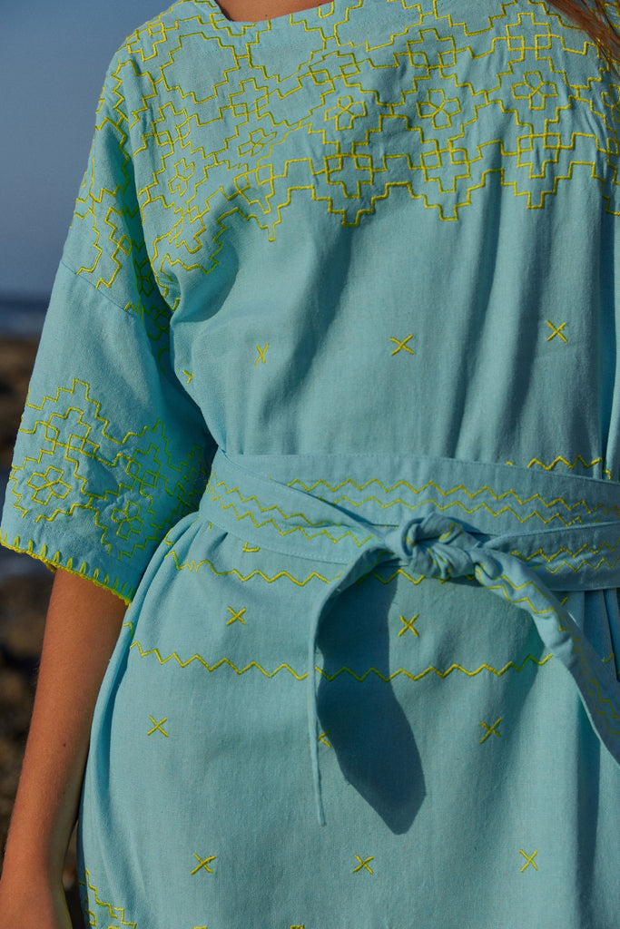 A long maxi length. Generous 3/4 sleeves. Deep pockets. Each kaftan takes 5 hours to embroider along with blanket stitching that traces the sleeves and hem.