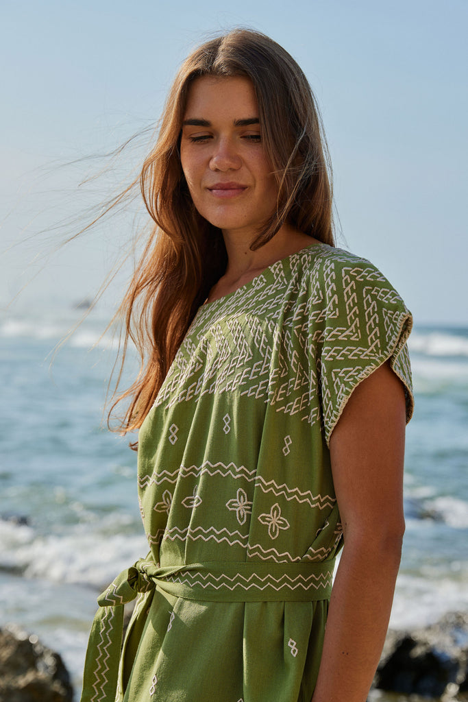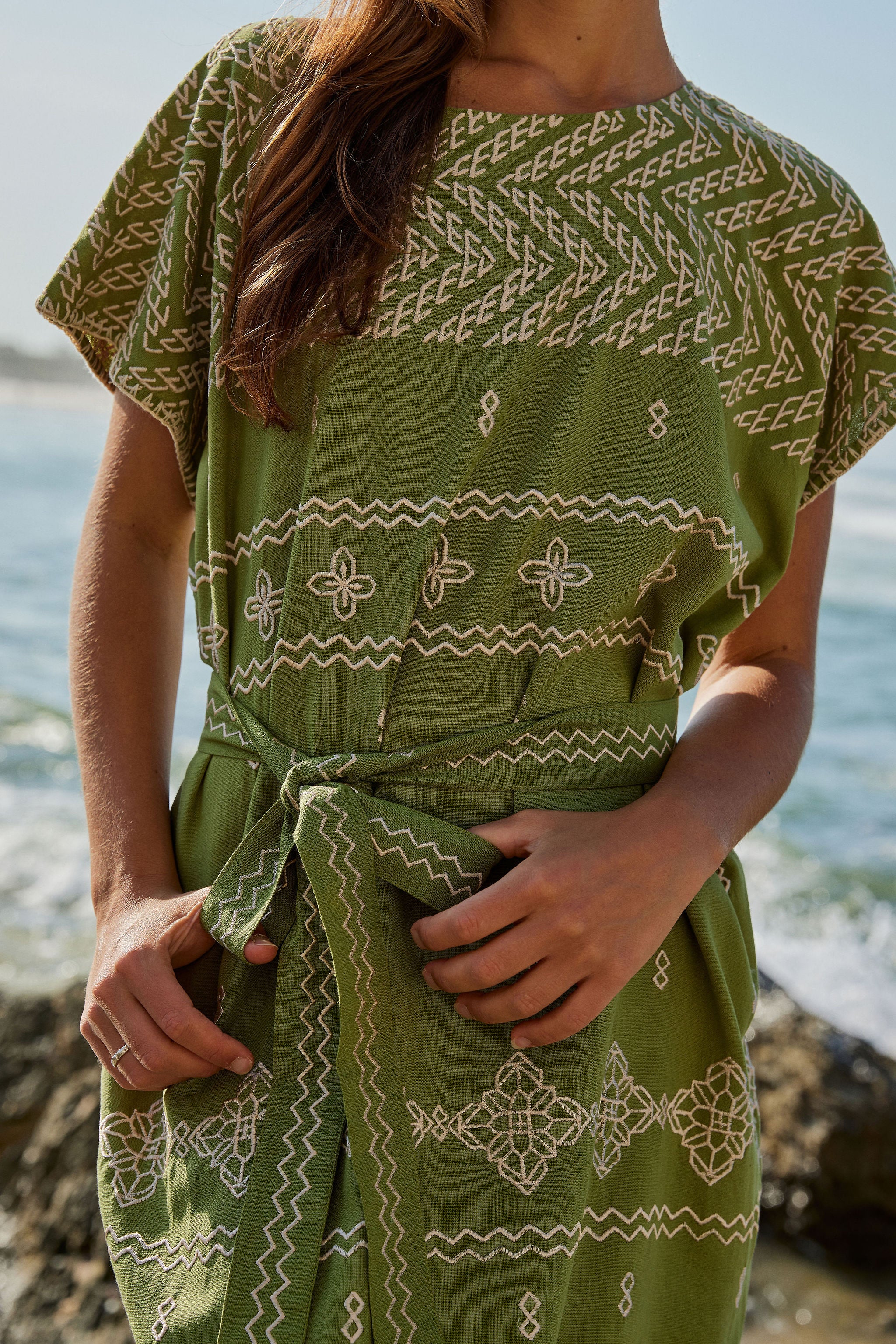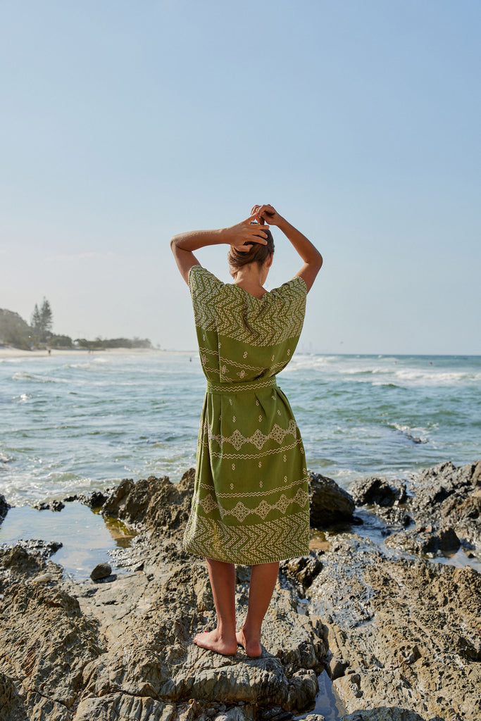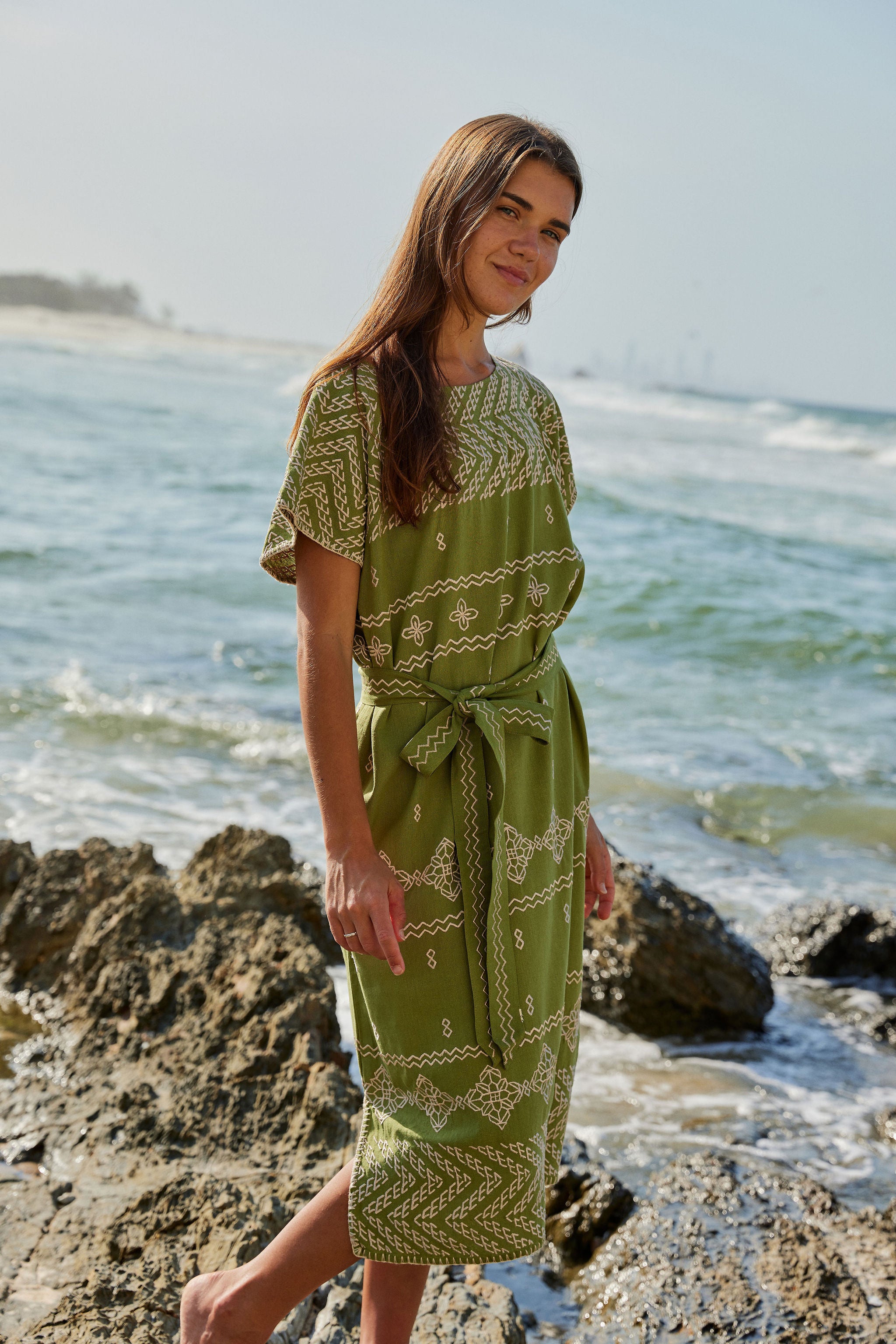 Perfect for effortless mornings, sun-soaked afternoons, and balmy evenings, all in one beautifully flowing piece. The mid length gives you that sweet spot of coverage and movement, while those soft capped sleeves keep things light and feminine & the cream embroidery contrasts beautifully with the green kaftan.