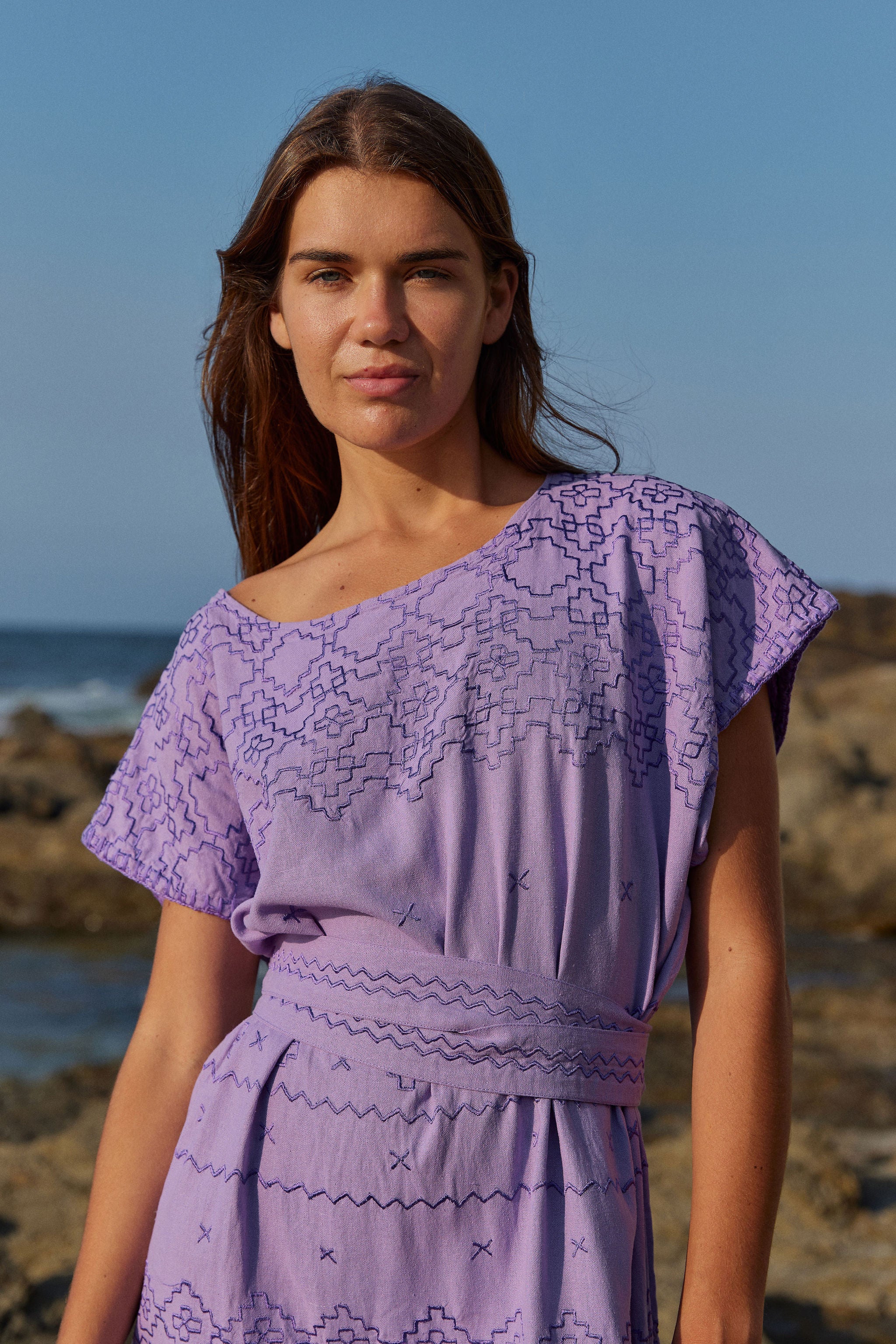Perfect for effortless mornings, sun-soaked afternoons, and balmy evenings, all in one beautifully flowing piece. The mid length gives you that sweet spot of coverage and movement, while those soft capped sleeves keep things light and feminine. The tonal purple embroidery contrasts beautifully with the violet kaftan & is perfect for lovers of colour.